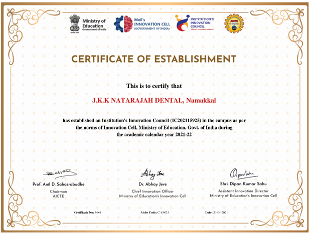 In the academic year 2021-22, JKKN Dental College & Hospital established the Institution's Innovation Council (IIC) under the guidance of the Ministry of Education's Innovation Cell (MIC) in collaboration with AICTE. The IIC at JKKN aims to systematically foster a culture of innovation and entrepreneurship within the institution by engaging faculty, students, and staff in various activities such as ideation, problem-solving, Proof of Concept development, Design